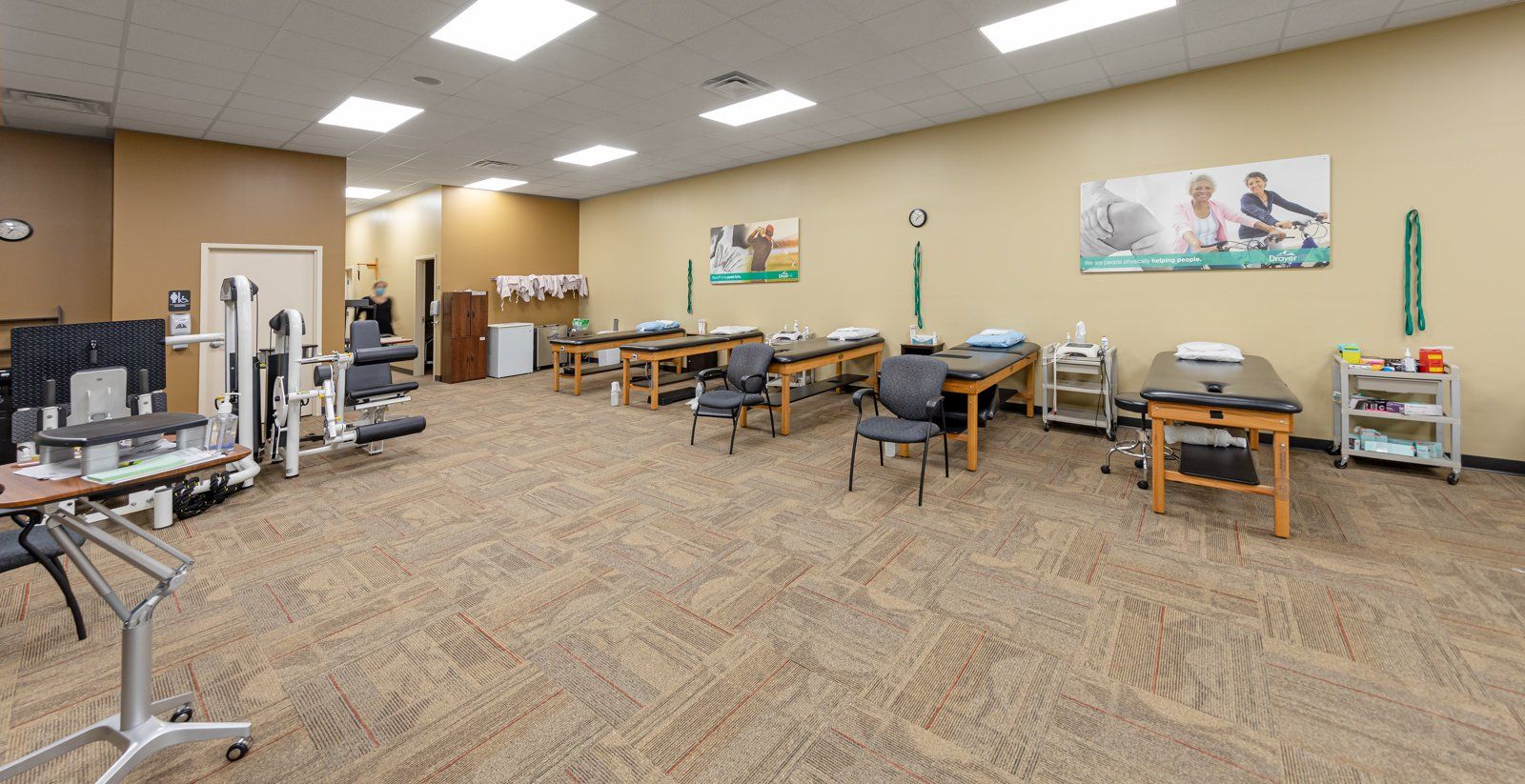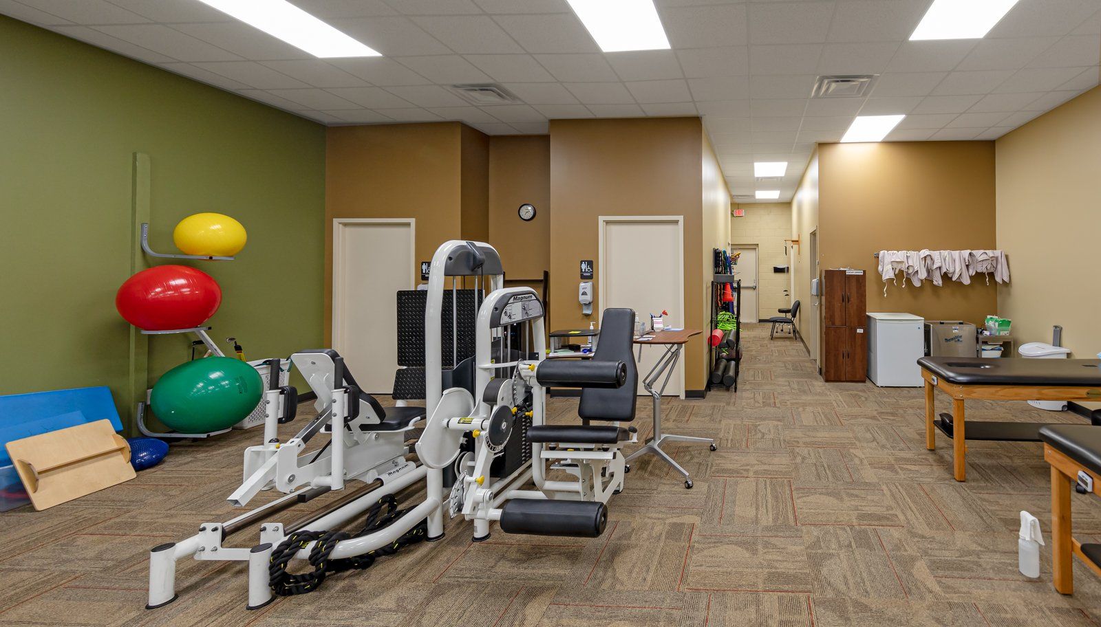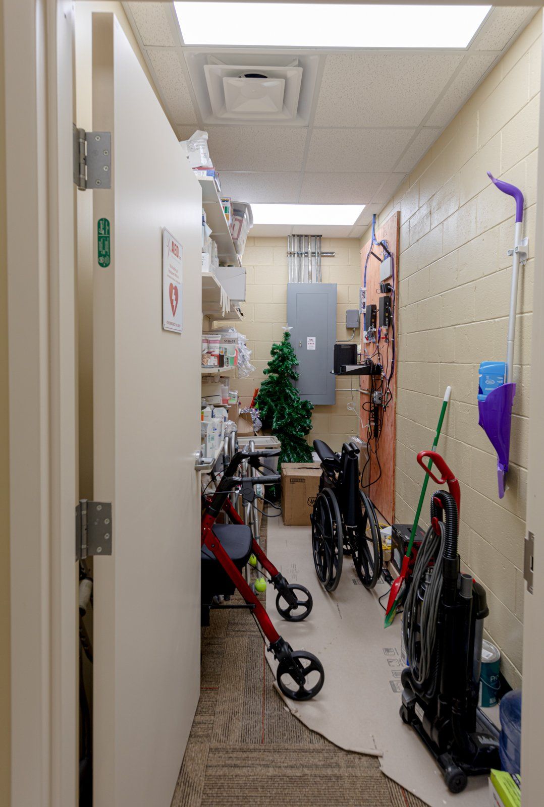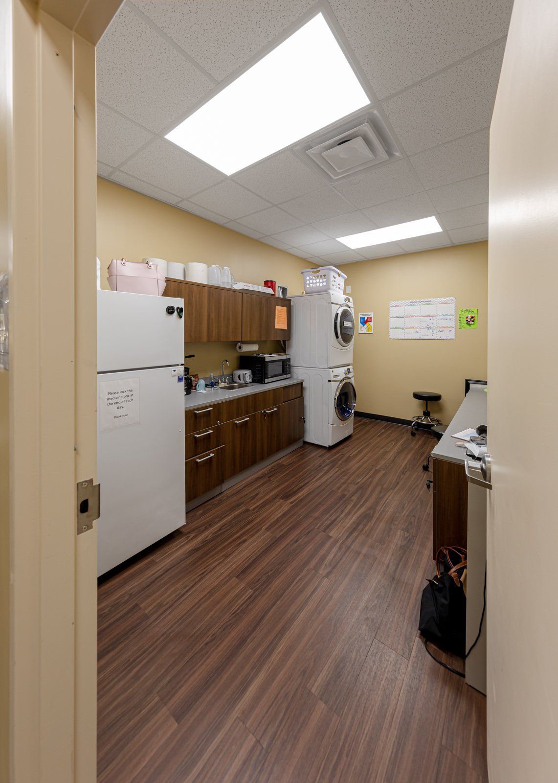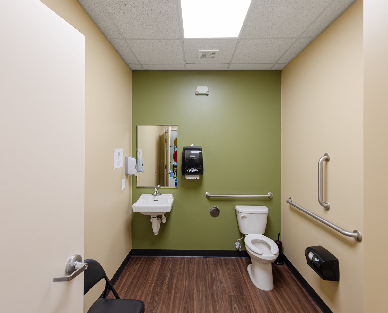 The lobby features our preferred Luxury Vinyl Flooring in a wood grain pattern, which provides a visual separation of the lobby and therapy area. The pattern of the carpet squares ties the color of the lobby's accent wall into the overall design. This space allowed for two large ADA compliant restrooms that feature the same flooring and as the lobby with painted accent walls. The laundry room and breakroom were strategically designed so that they could share the same space in an organized manner.